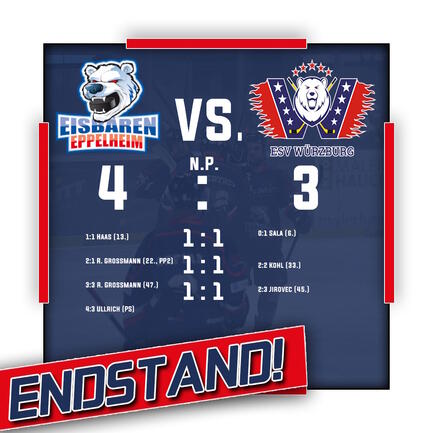 Mit dem 2:2 ging es leistungsgerecht ins Schlussdrittel, in dem nun unsere Eisbären vermehrt die Strafbank aufsuchen mussten. Zwar konnte Würzburg dies zunächst nicht nutzen, aber die aufgebaute Drucksituation führte kurz nach Ende einer Unterzahl zur erneuten Gästeführung. Doch erneut war R. Großmann zur Stelle, den schnellen Ausgleich wiederherzustellen (47.). Auch wenn das Spiel ein reiner Test war, kämpften beide Teams nun um die Entscheidung. Zunächst mit Vorteilen für Eppelheim, in den letzten Minuten dank einer doppelten Überzahl für Würzburg, doch am Ende rettete die Sirene das Remis.